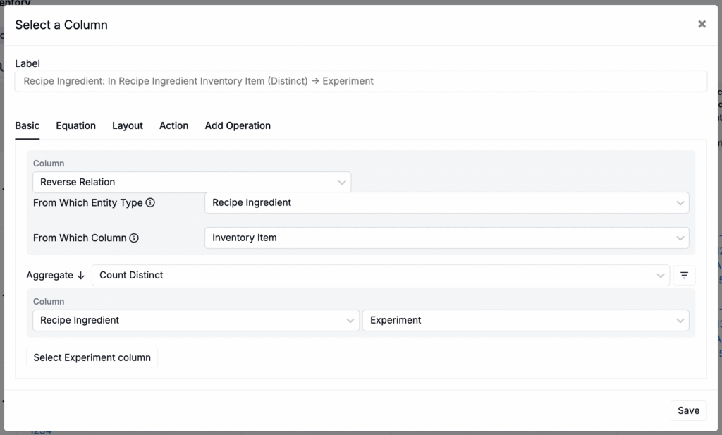This column type can be used to show the number of experiments that use an inventory item. To configure: