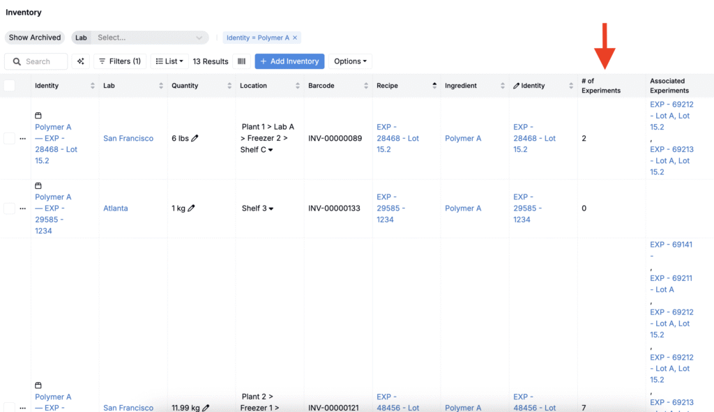 Once saved, the column will be displayed on the listing, giving you a count of only the unique experiments in which a given inventory item is used.