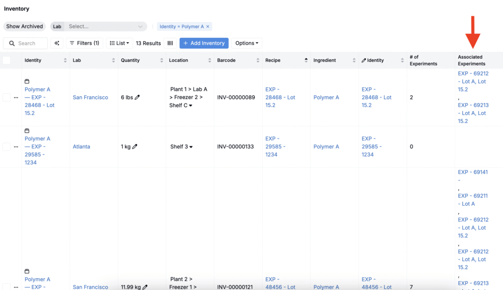 This column shows the names and links to all experiments that use each inventory item. To configure: