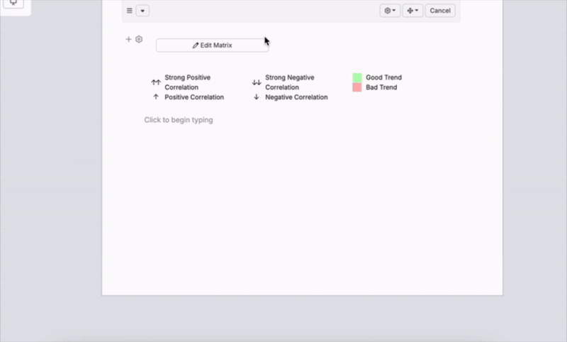 Insert a Correlation Matrix to visualize relationships between selected inputs and outputs. Click the pencil icon to open the matrix editor, select variables to include, and define correlations by clicking directly into the matrix.