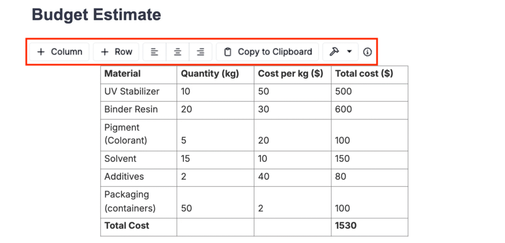 Create lightweight tables to summarize information manually. Add or remove rows and columns using the + Row and + Column buttons, and align content left, center, or right.