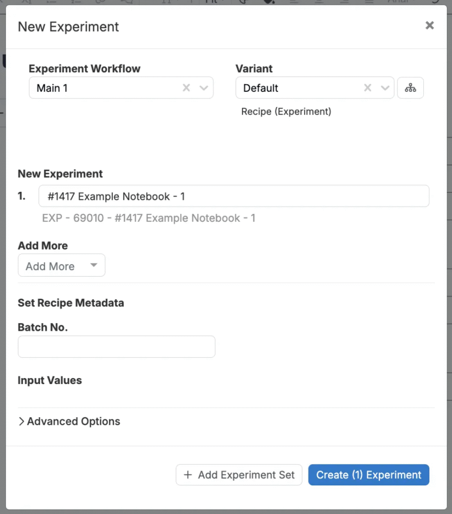 Create experiments directly from your Notebook. In the modal, name the experiments, assign a workflow, and select a variant.