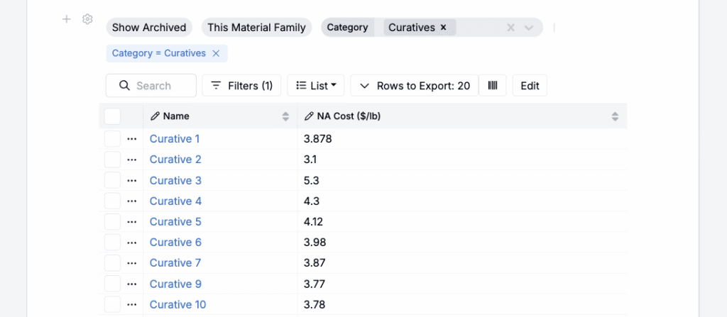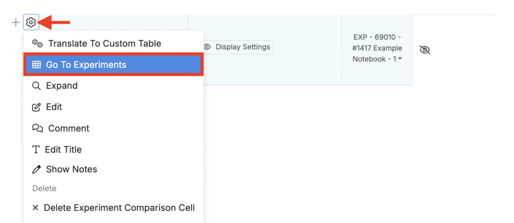After creation, Uncountable automatically adds an experiment comparison cell for the new record. To edit experiment recipe and measurements, click ⚙️ > Go to Experiments.