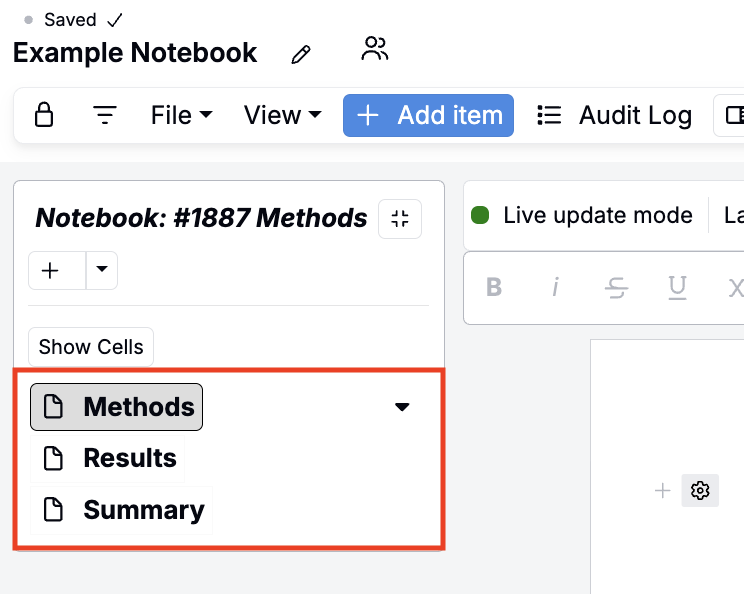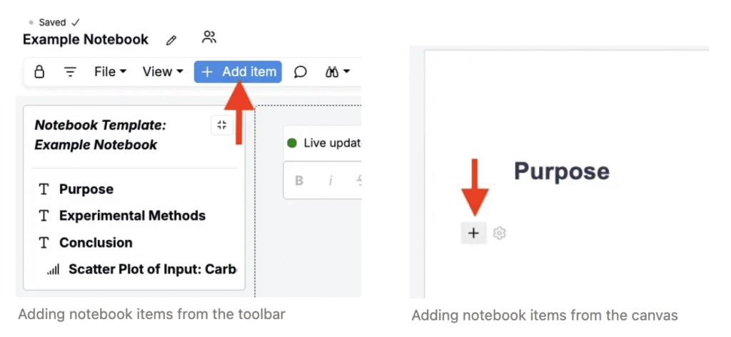 In Uncountable, Notebooks are built from individual items (or cells), which are modular blocks that display text, data, plots, comparisons, and more. You can add, rearrange, and edit these items to create reports, summaries, dashboards, or analysis pages.