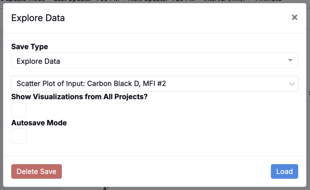 You can also load saved visualize plots directly into your Notebook. In the modal, select an Explore Data save and click Load.