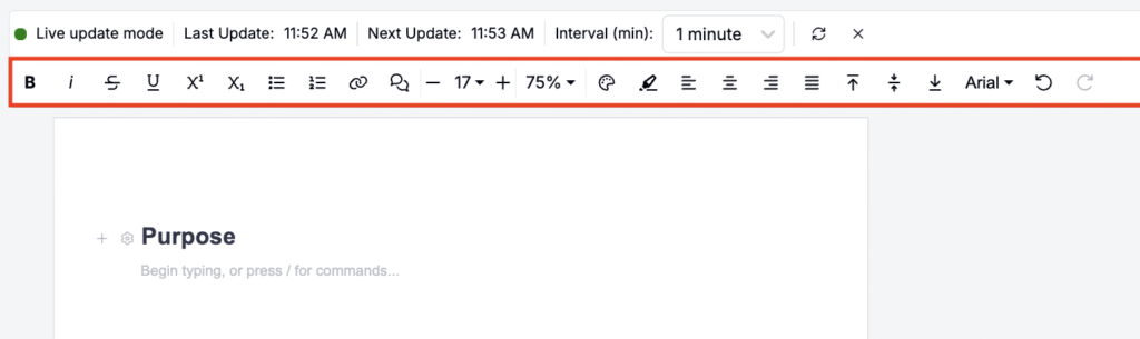 Insert text blocks to add section headers, notes, commentary, or instructions. Use the toolbar at the top of the page to format text (bold, italic, underline), change color, add links, or leave comments.