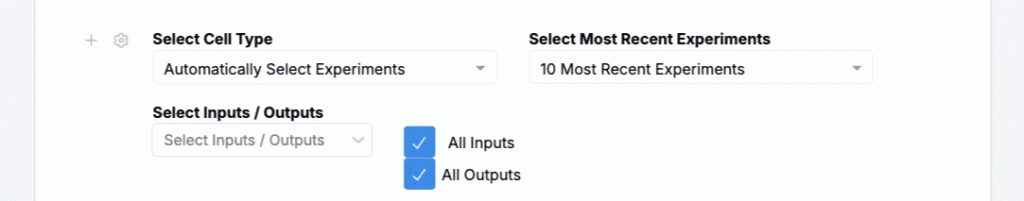 - Select Inputs/Outputs — Manually select which inputs or outputs to include or use the checkboxes to include all inputs and outputs from the selected experiments.