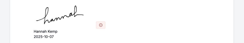 Once signed, the block displays the signer’s name, timestamp, and signature image.
