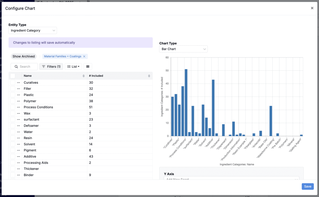 - Configure axes and groupings, then click Save to display your chart.