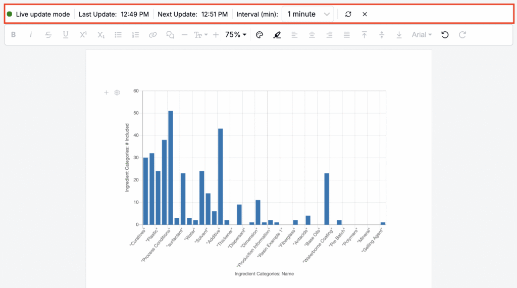 Once added, the chart is embedded directly in your Notebook. Charts are dynamic, meaning that when Live Update Mode (View > Toggle Live Update Mode) is enabled, any changes to the project data are automatically reflected in the visualization.