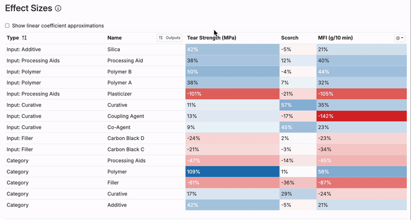 - For projects with cumulative ingredient effects or limited individual input impact, weaker trends in the table are common. In these cases, understanding the balance of all ingredients becomes more critical.