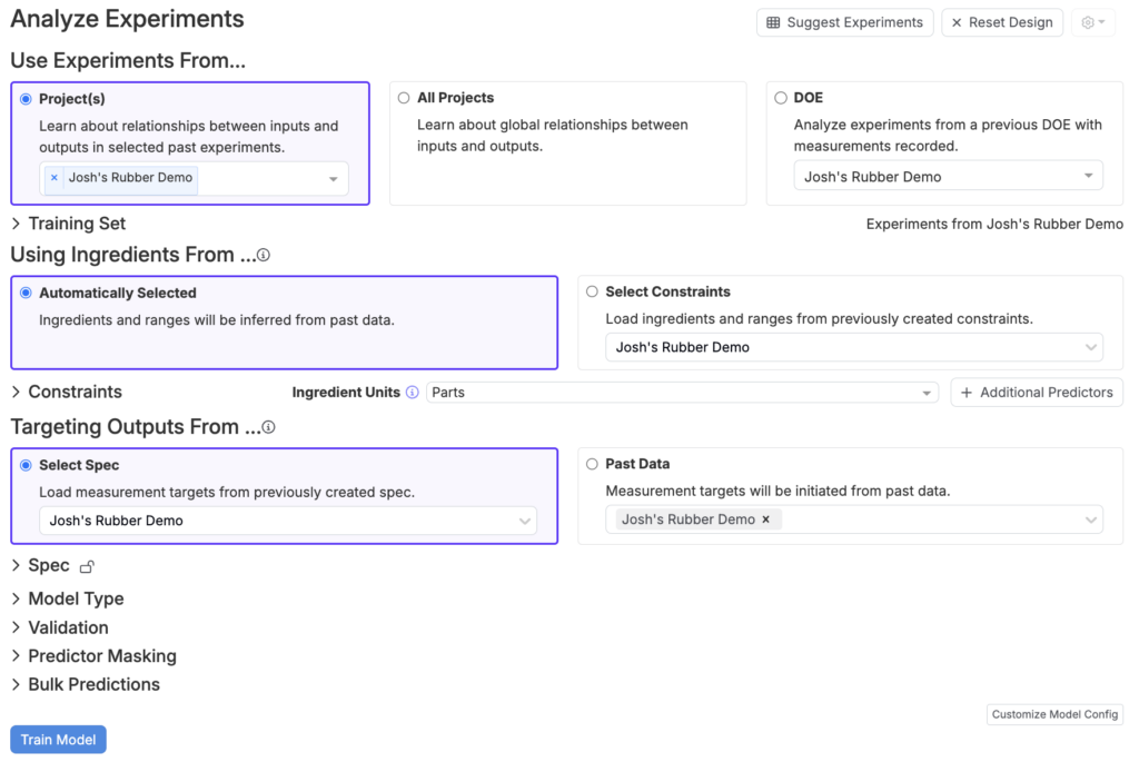 Once sufficient data has been collected, the Analyze with AI and Suggest with AI tools can help identify which inputs have the strongest influence on outputs, predict outcomes for hypothetical formulations, and guide future experimentation with actionable suggestions.