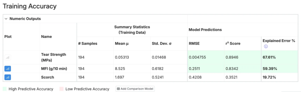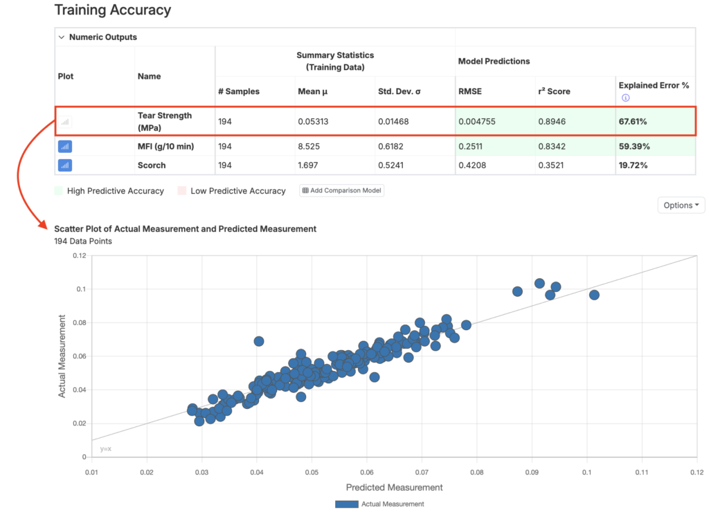 The Training Accuracy scatter plot provides a visual representation of the predictive quality of a selected output (i.e. Tear Strength) by comparing predicted values against actual measurements. To select an output for the plot, click the corresponding plot icon in the Training Accuracy table.