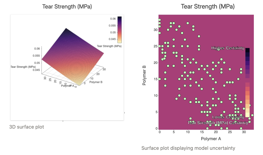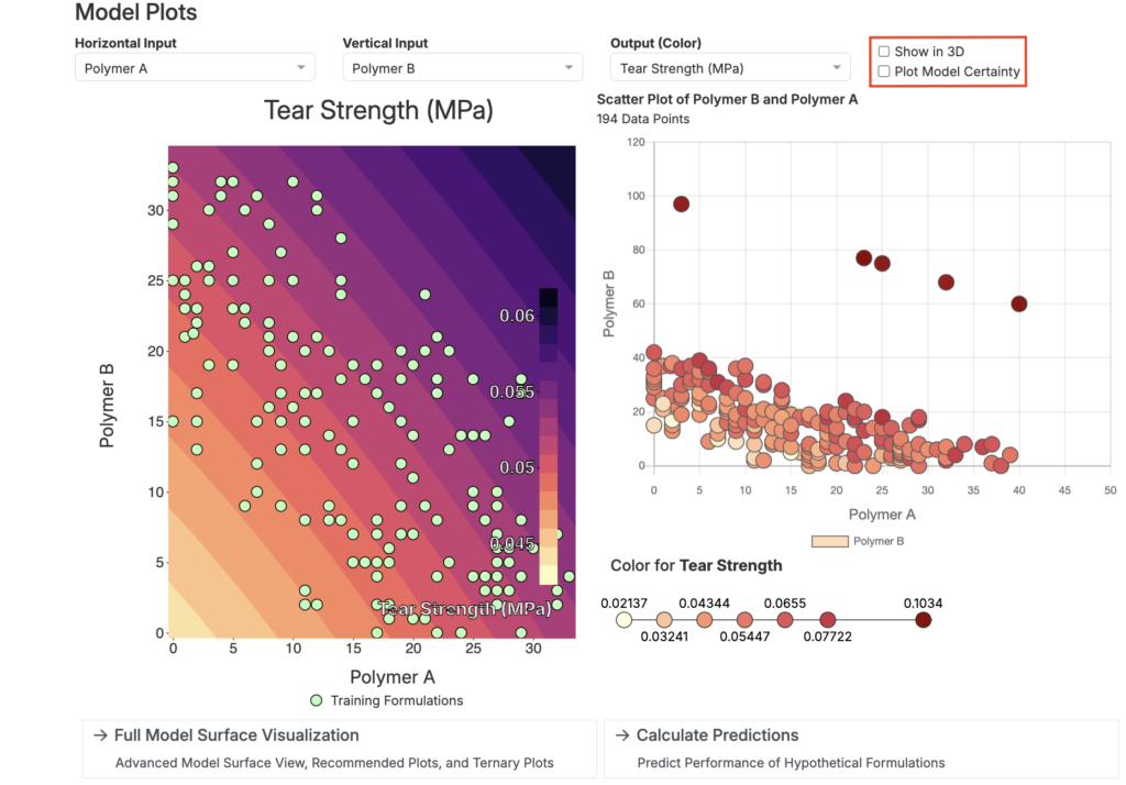 In the Model Plots section, users can use surface and scatter plots to explore how two input parameters affect a single output.