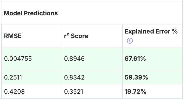 - Explained Error: Normalizes RMSE relative to the standard deviation of the dataset. This comparison accounts for differences in magnitude across outputs, enabling consistent evaluation. Higher values, closer to 100%, signify more accurate model predictions.