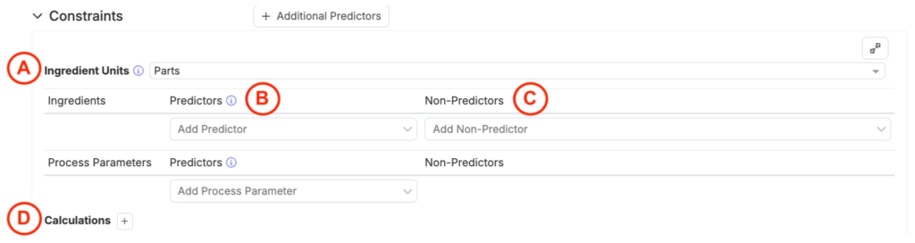 - Non-Predictors (C): Ingredients and process parameters designated as non-predictors can still be used to calculate experiment properties but do not directly affect output performance predictions.