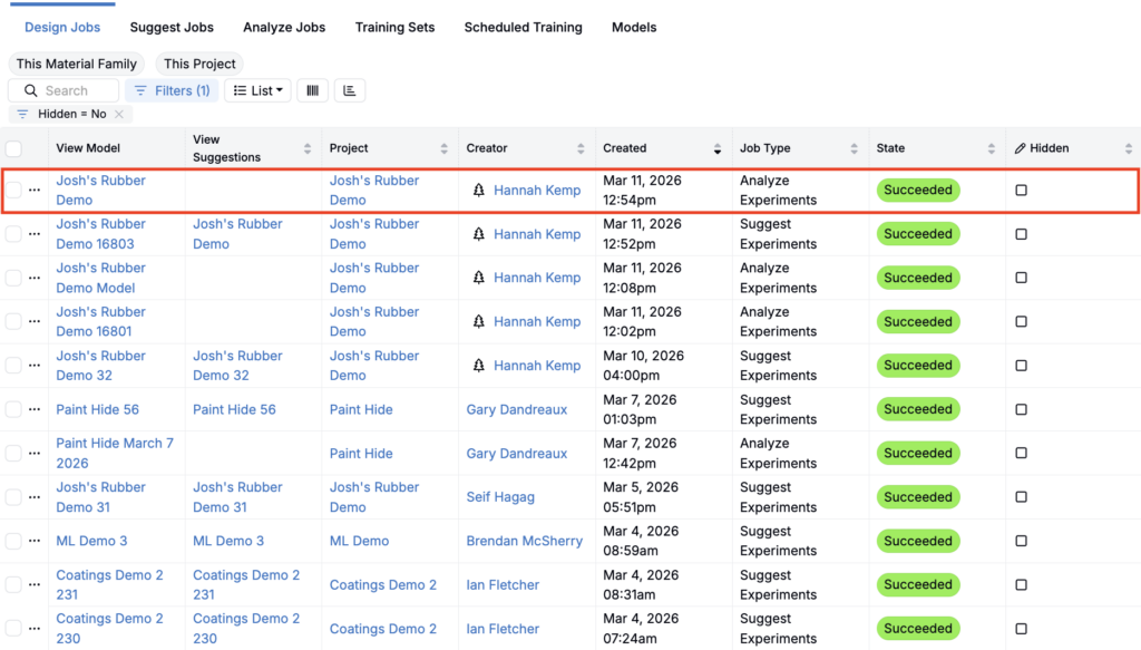 To access a saved or previously run model, navigate to the View Past Jobs page by selecting Design > View Past Jobs. Here, you’ll find a listing of all previously run models. Models cannot be deleted, but they can be “Hidden”.