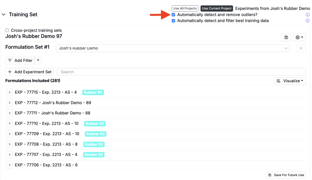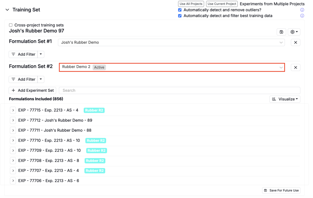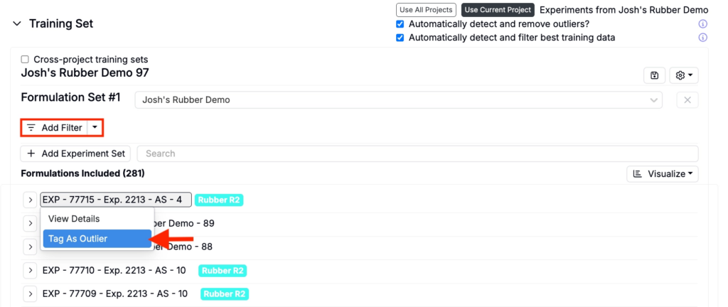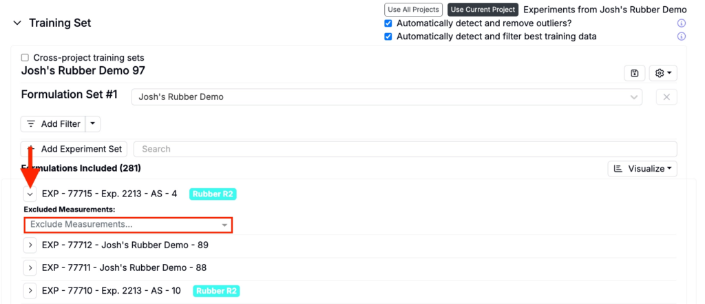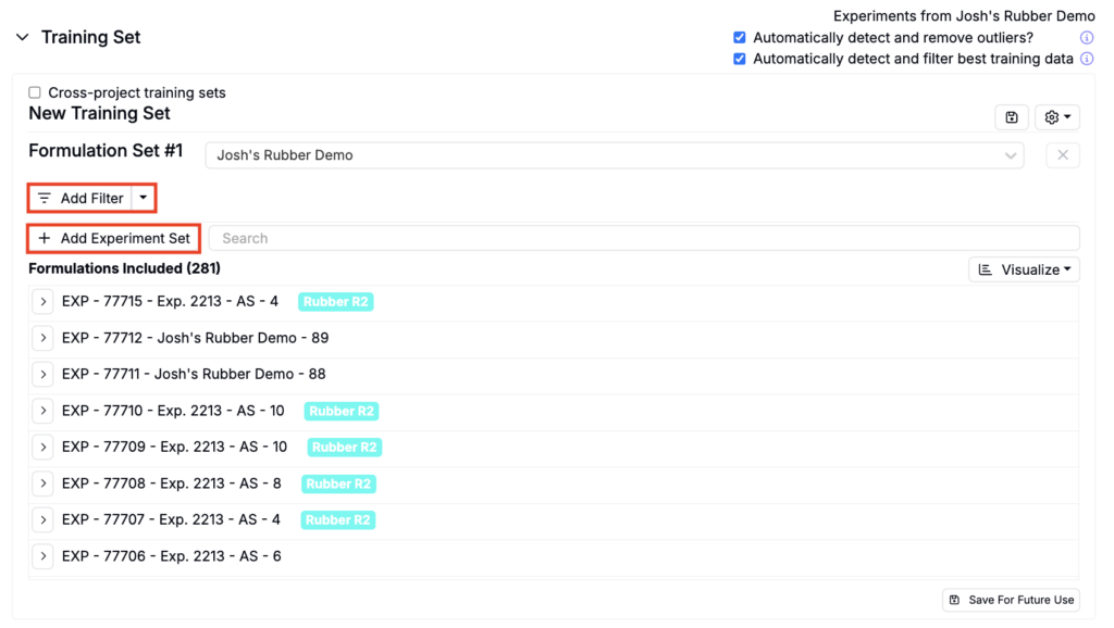 Under Training Sets, refine experiments by adding filters, and/or additional formulation sets.