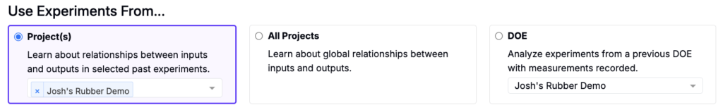- DOE — Focus solely on experiments from a DOE previously created in Uncountable. Note that DOE data is automatically included when selecting the Project(s) option.