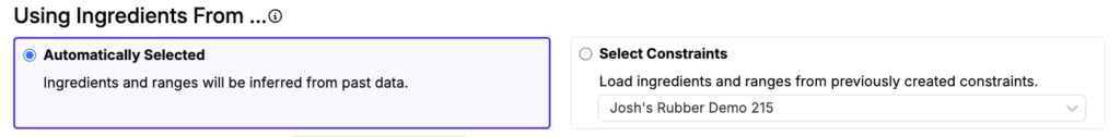 If a formula or experiment includes inputs that aren’t in the model, the platform will suggest the closest available substitute. If no substitute is appropriate, or if the missing input is important, add it to your model constraints and retrain the model.