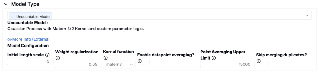 The Uncountable platform is powered by Uncountable’s proprietary models, which are built on a Matérn-kernel Gaussian Process (GP). This GP model underpins much of the platform’s functionality and is the default model type for Analyze jobs.