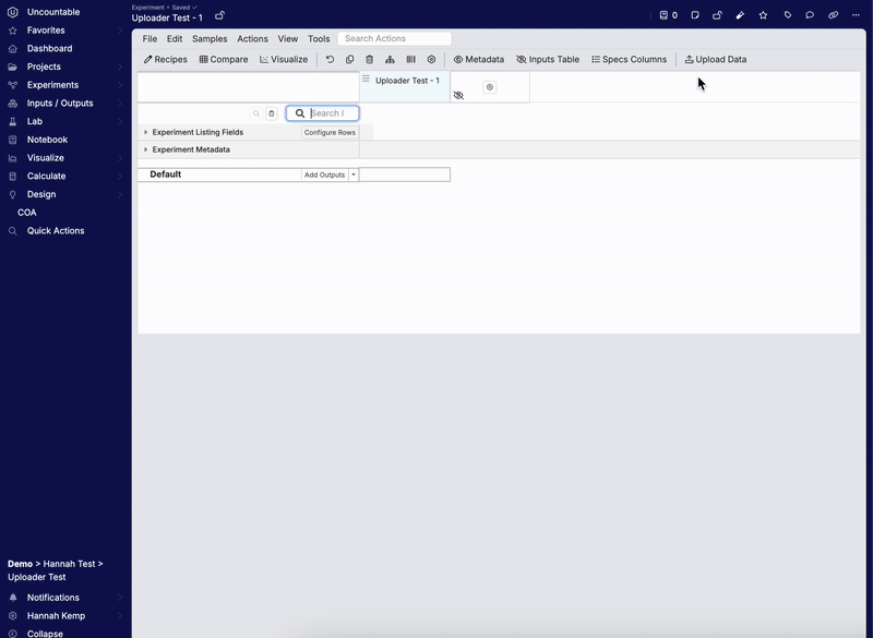 データをアップロードするには、実験アウトプットビューでUpload Dataモーダルを使用します。ファイルをドロップすると、アップローダーが値を解析します。承認されると、そのデータは実験にインポートされます。ただし、アップローダーがデータを解釈し、マッピングするには、初期設定が必要です。