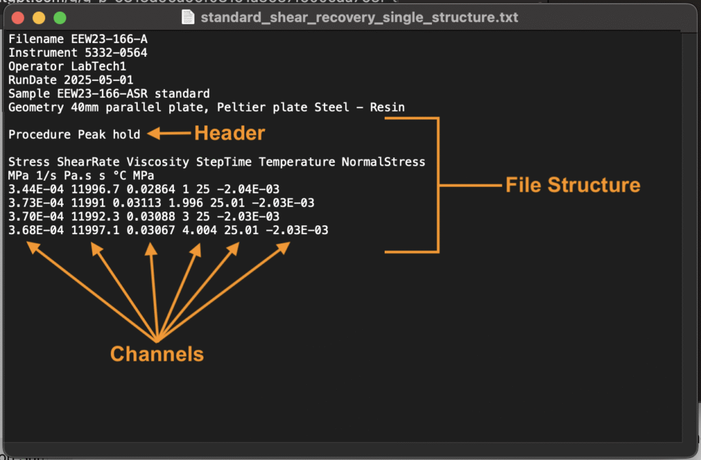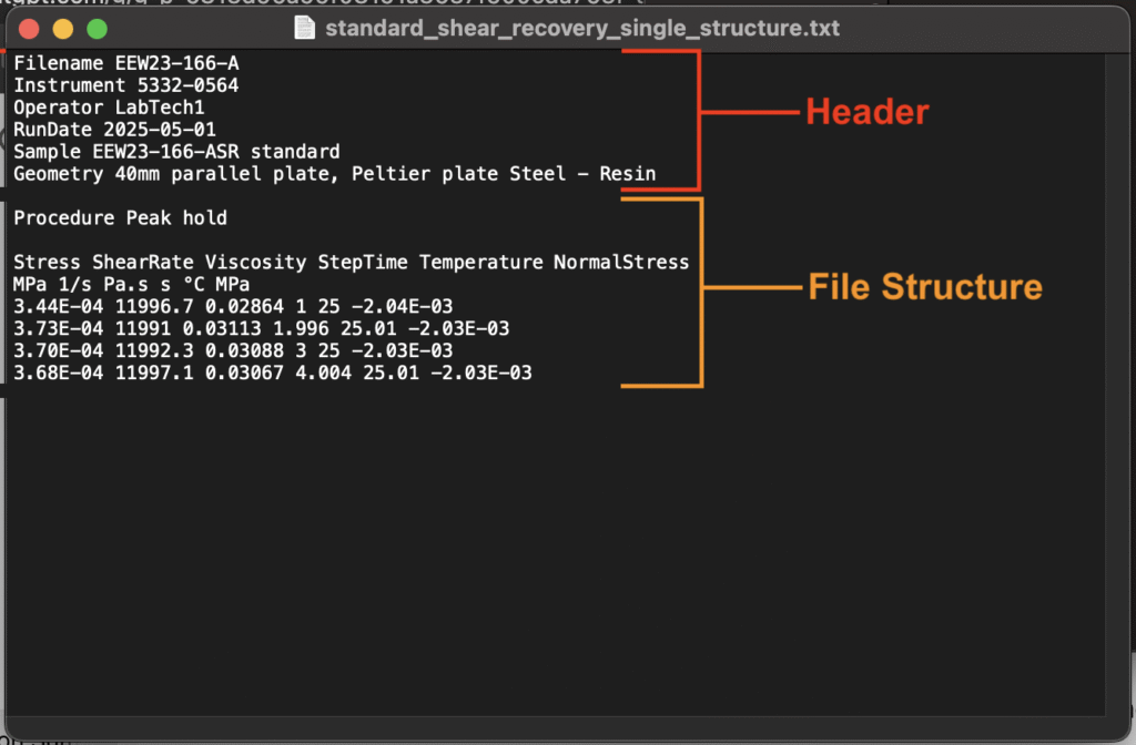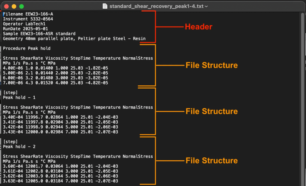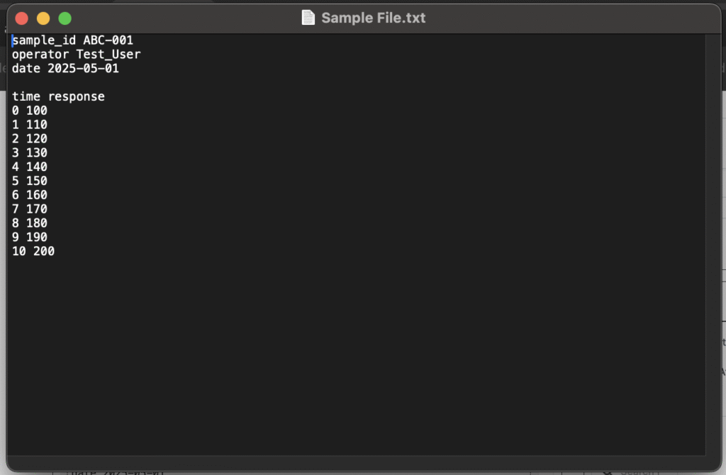 - ヘッダー:ファイル名、使用した機器、オペレーター、実行日など、ファイル全体に適用される情報を含みます。ヘッダーフィールドは、1つのフィールド名と1つの値のペア(1:1 フィールド:値)で構成されます。