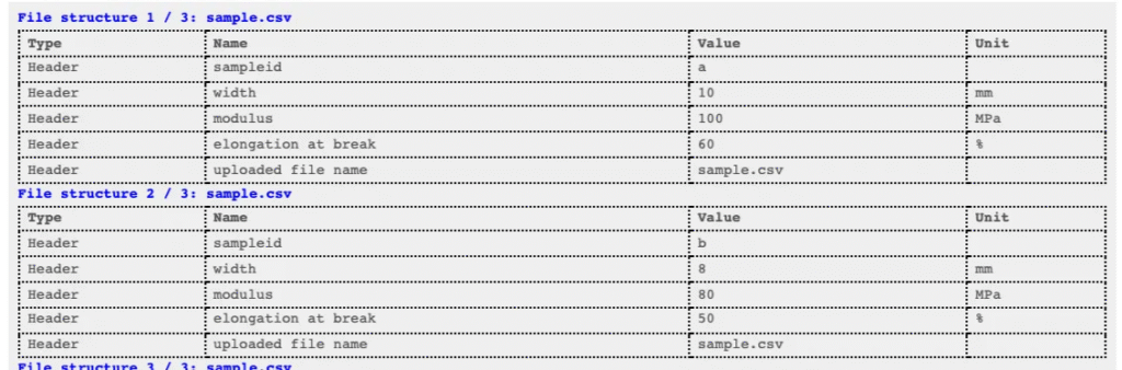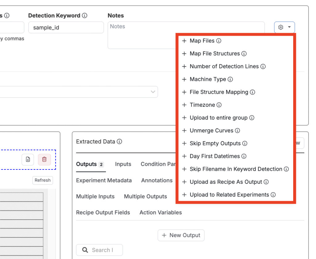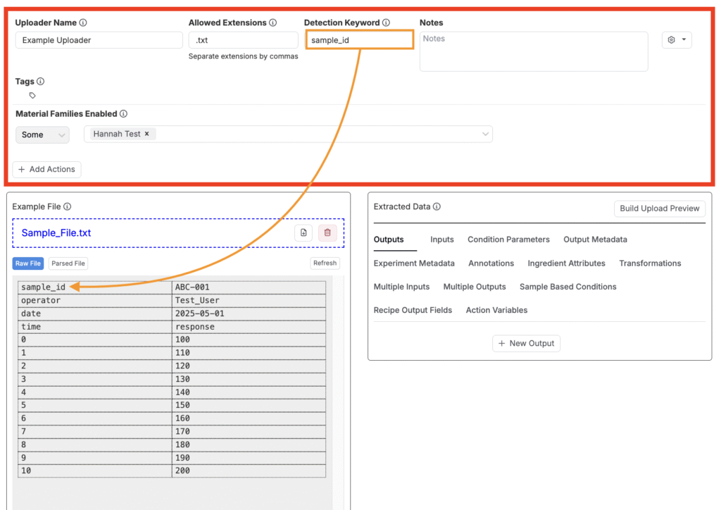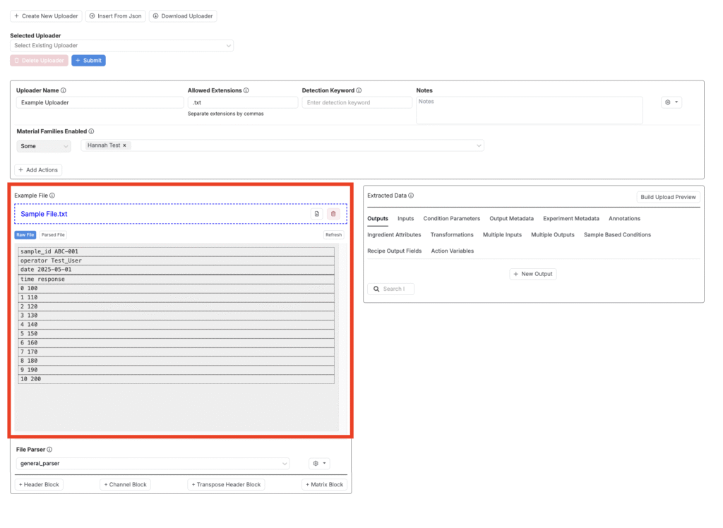アップローダーを使用すると、値を手動で入力する代わりに、生の装置ファイルを直接Uncountableにドラッグ&ドロップできます。アップローダーは、生ファイルから数値や曲線の出力、条件パラメータ、メタデータなど、さまざまな種類のデータを抽出するために使用できます。