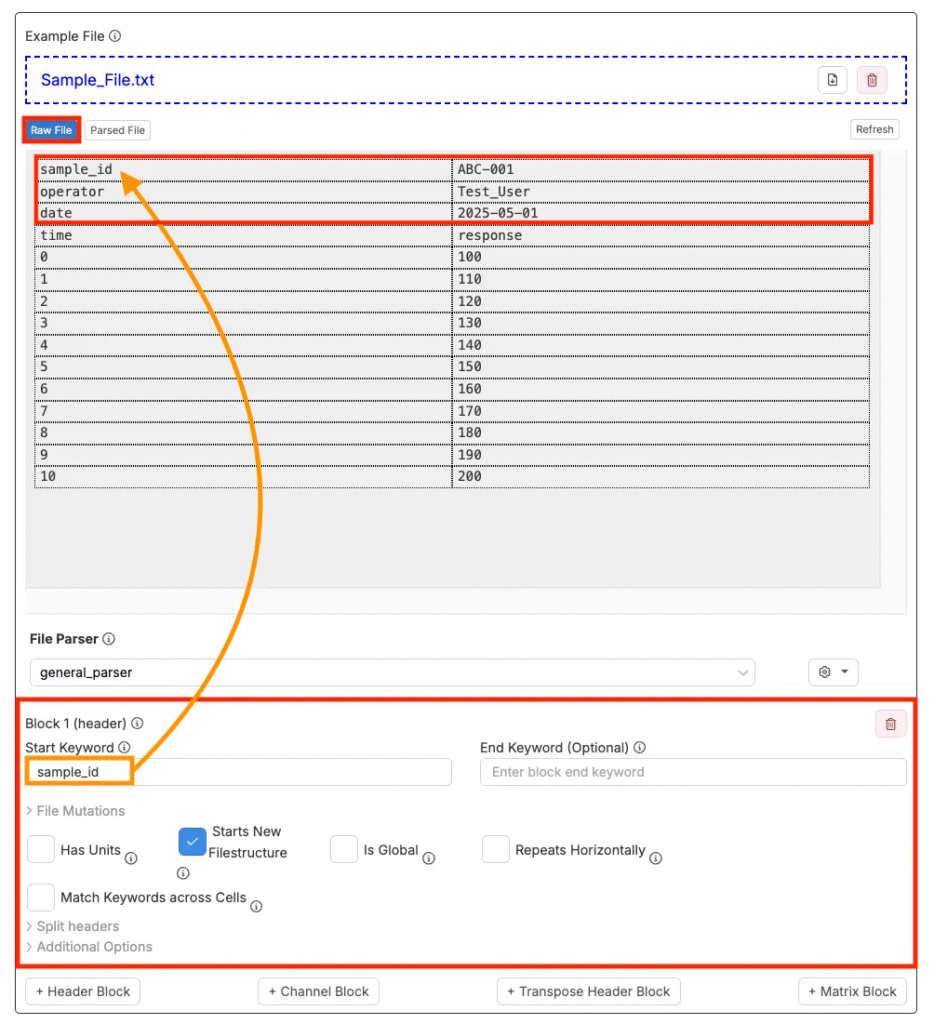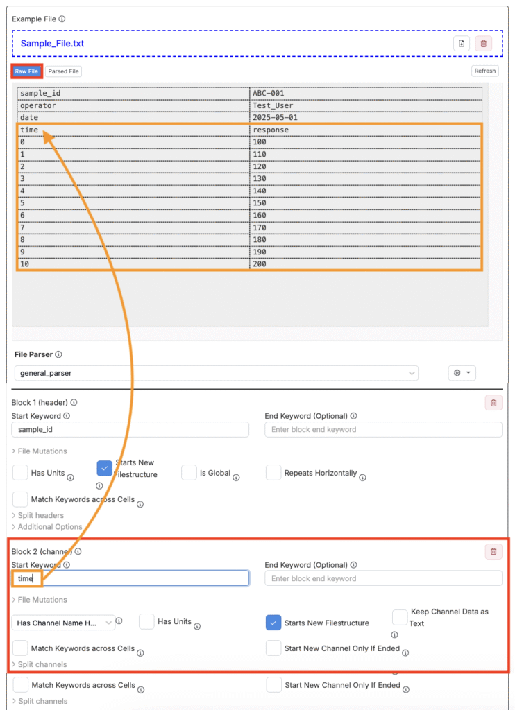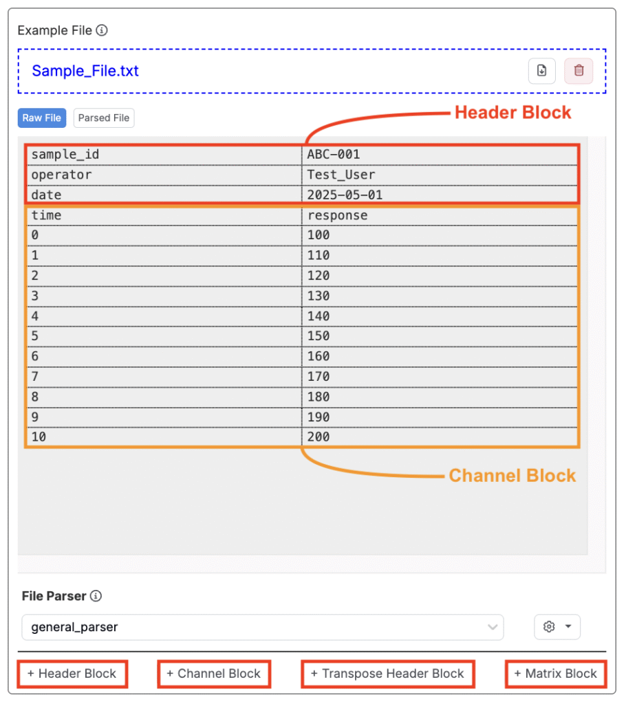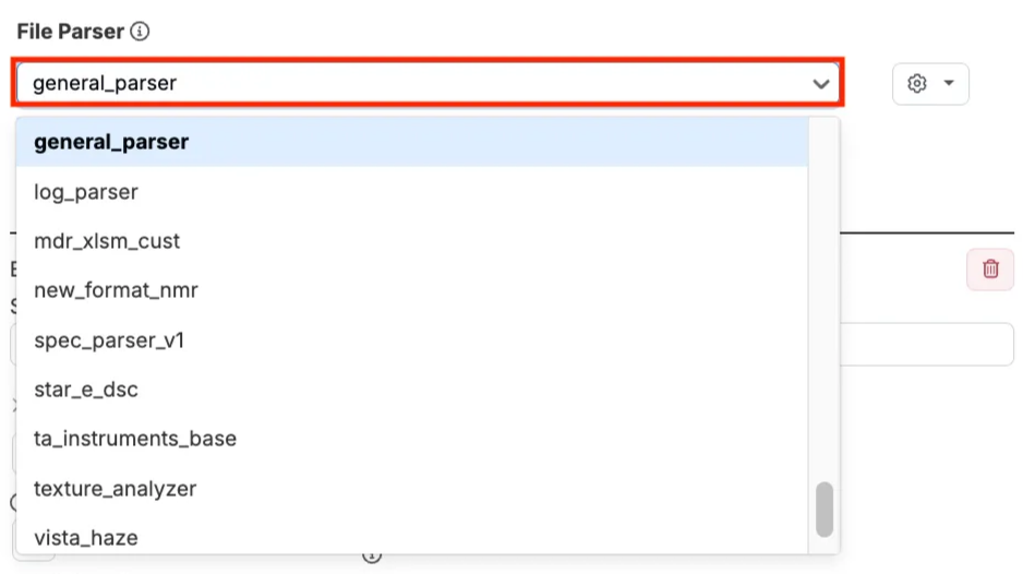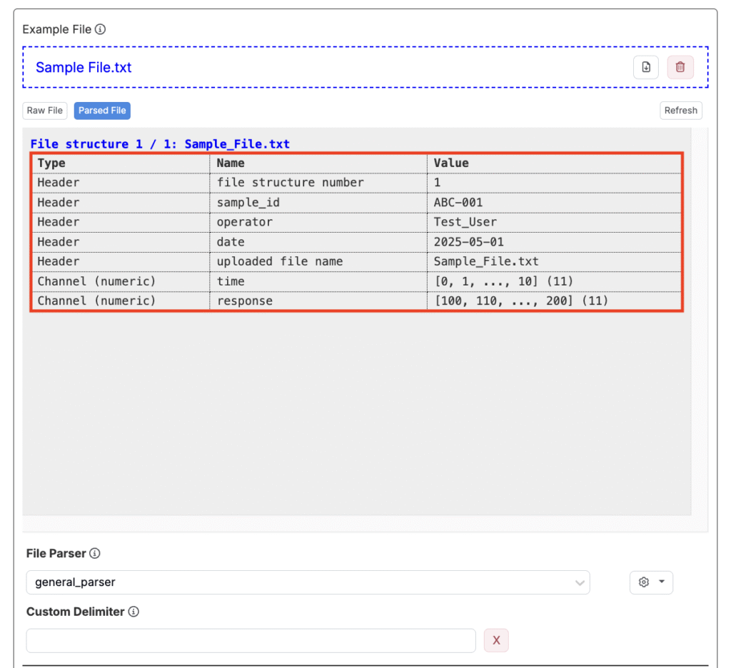 次に、パーサーを選択します。パーサーはファイルの生テキストを読み取り、構造化された要素(ヘッダー、チャンネル、データ値)に分解し、システムが自動的に理解・処理できるようにします。