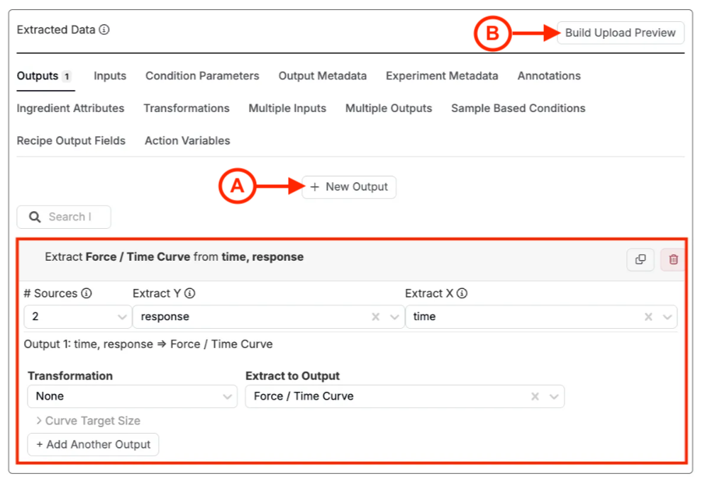 - 「アウトプットに抽出」フィールドを使用して、Uncountableがデータをどこに送信するかを指定します。既存の出力を選択するか、このフィールドから新しい出力を直接作成できます。