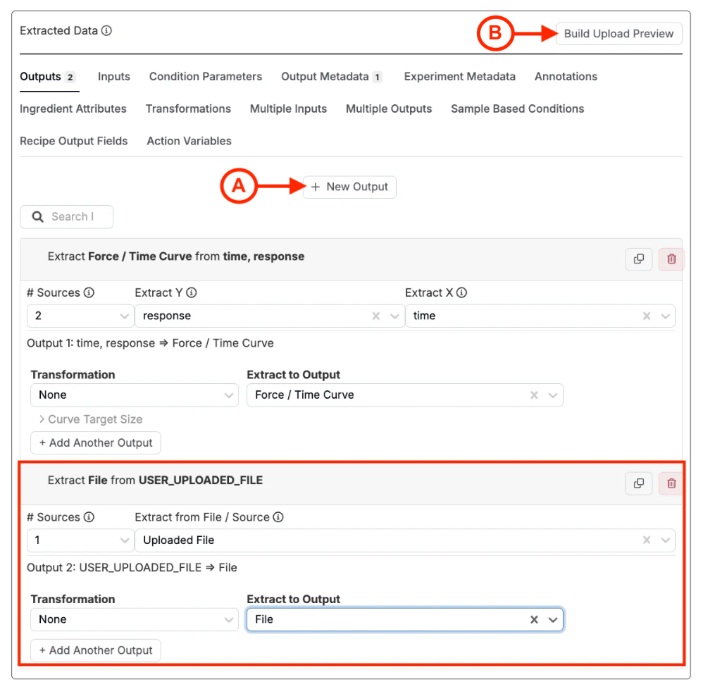 「アップローダーを編集」ページの「抽出データ」セクションでは、解析された各データが何を意味し、システム内のどこに配置されるべきかを決定します。データをアウトプット、インプット、条件パラメータ、メタデータなどに抽出するためのタブがあります。
