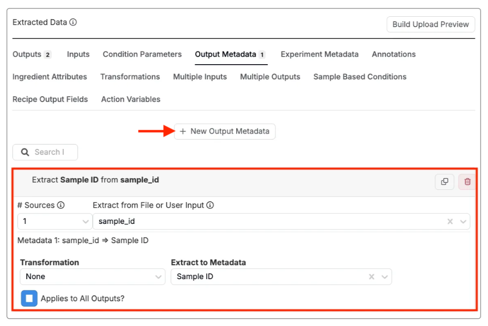 - 「抽出データ」セクションの「Output Metadata」タブをクリックします。