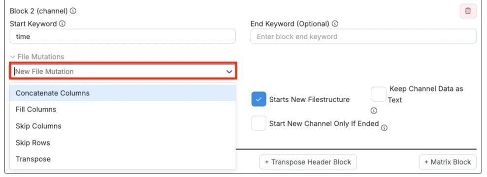 - 「新しいファイル構造を開始」:チェックすると、このブロックは新しいファイル構造を開始します。未チェックの場合、データは同じ構造の一部(1つの長い連結チャネル)として扱われます。