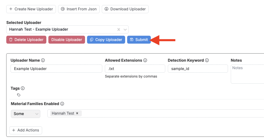 すべてのブロックをマッピングし、すべての設定を完了したら、「アップローダーを編集」ページの上部または下部にある青色の[+送信]ボタンをクリックします。