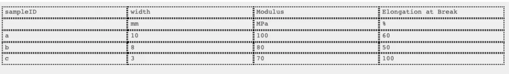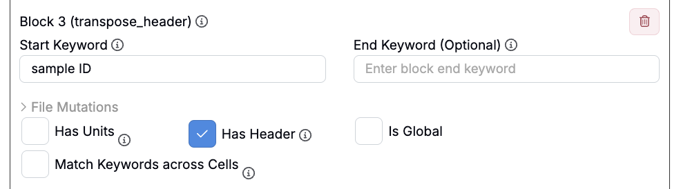 ヘッダーブロックを使用すると、アップローダーはファイルから個々の「フィールド:値」ペアを取得し、それぞれを別々のアウトプットとして扱います。ヘッダーブロックは、最初のセルをフィールド名、2番目のセルを値、3番目のセルを単位(単位自体が存在し、「単位あり」がチェックされている場合)として抽出します。