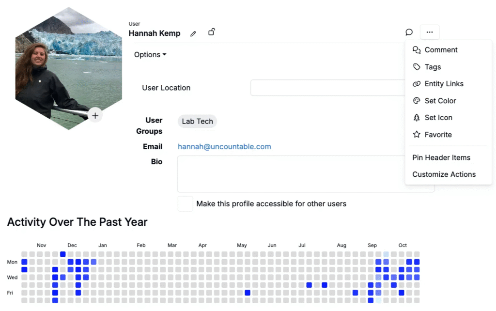 Use the Profile page to customize own personal Uncountable profile. Profile settings (photo, color, icon) appear next to your name in listings, comments, and other UI surfaces.