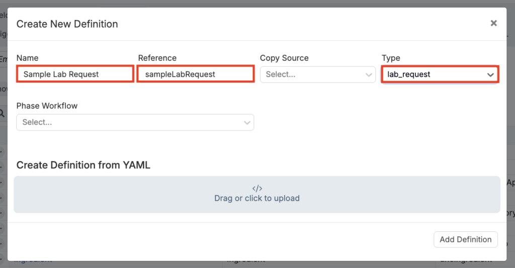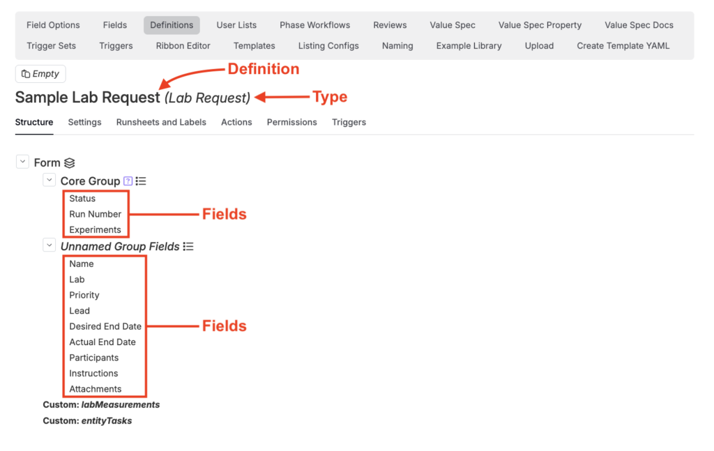 In Uncountable, definitions act as templates for the different types of entities users can create — such as experiments, lab requests, approvals, and more. Each definition specifies the structure and behavior of the entities based on it.