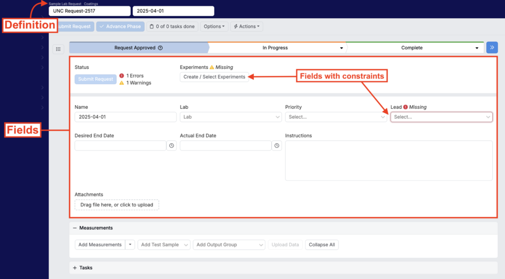 In this example, note how the Experiments field displays a warning, and the Lead field shows an error message. These indicators appear because constraints were added to those fields, prompting users to enter values before they can submit the request.