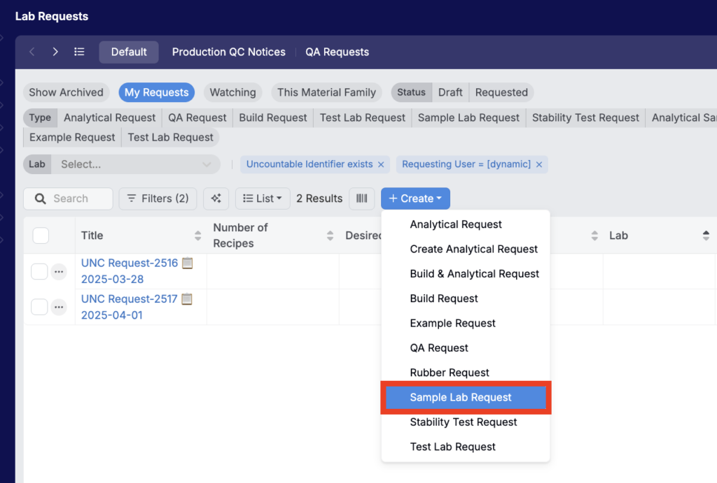 Since the new definition has a “Lab Request” type, it will appear as an option when creating a new request.