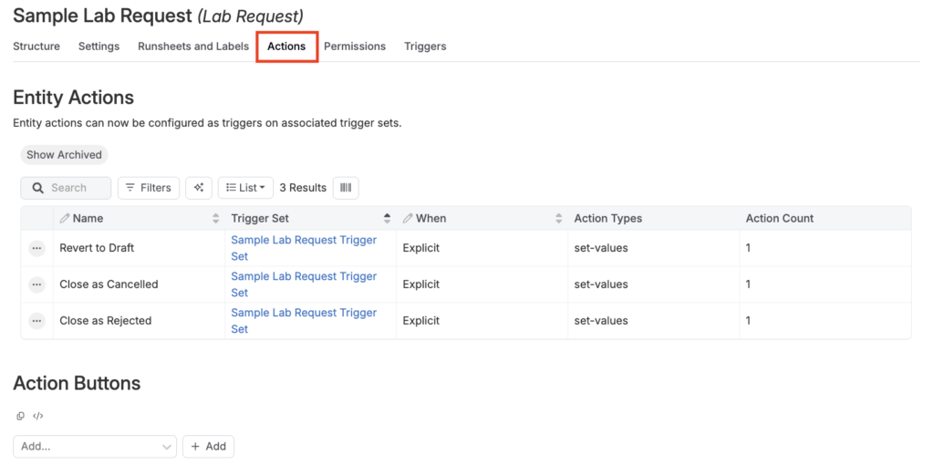 The Actions tab in a lab request definition contains two sections: Entity Actions and Action Buttons.