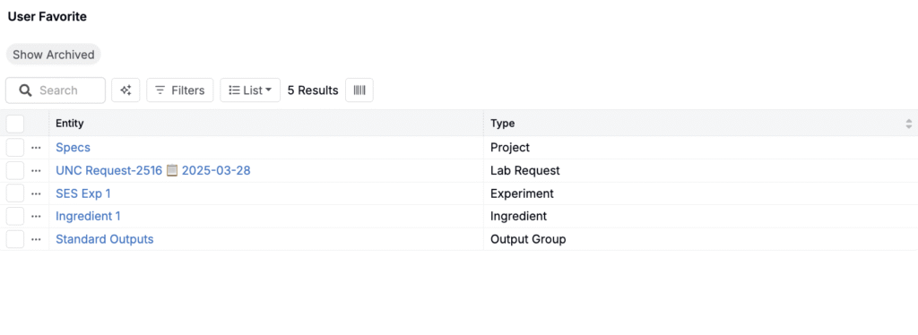 The User Favorites page shows all entities you’ve favorited across the platform—such as projects, experiments, lab requests, ingredients, and output groups. Like other listings, the table is searchable, filterable, and customizable with adjustable columns.