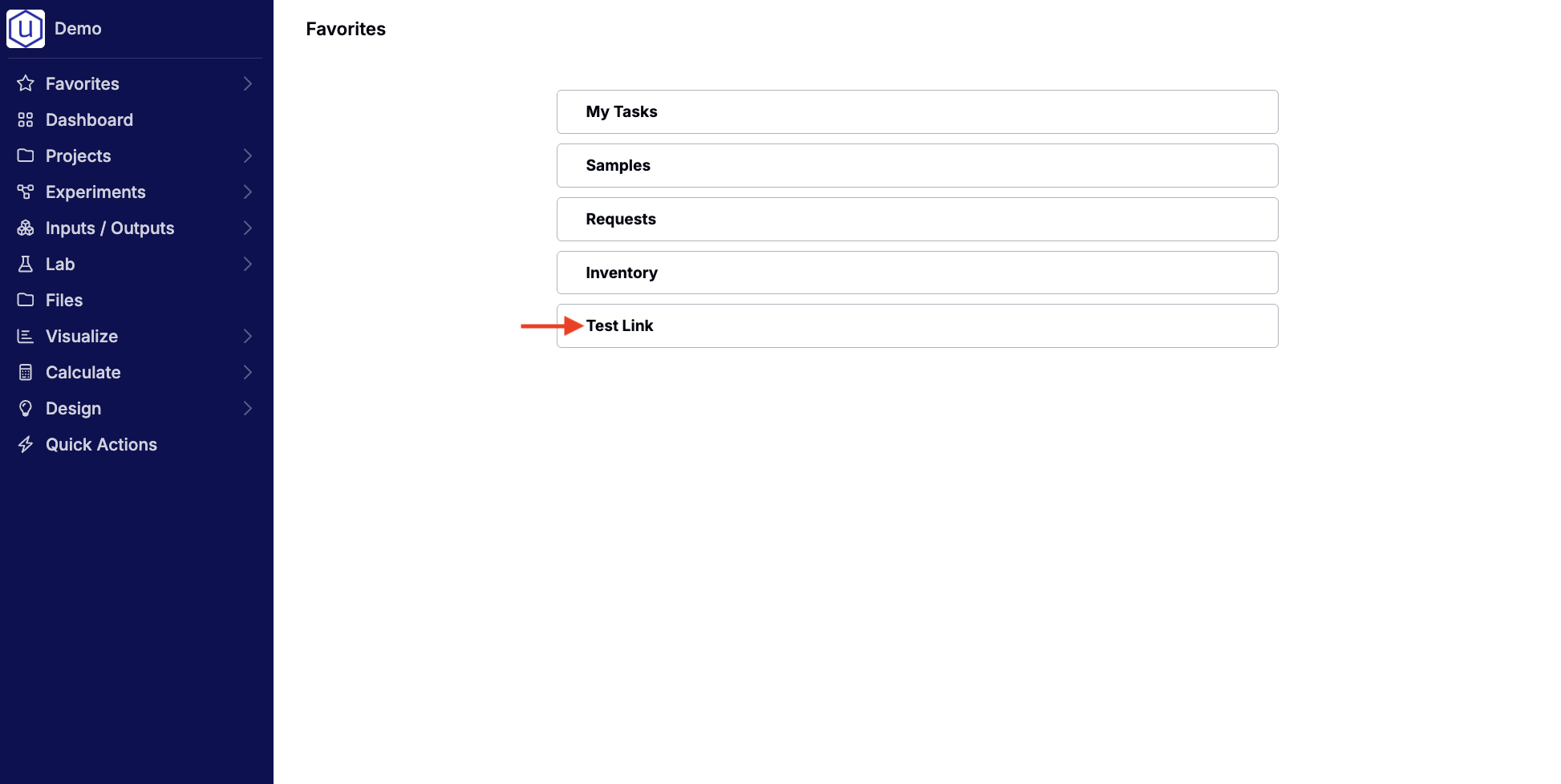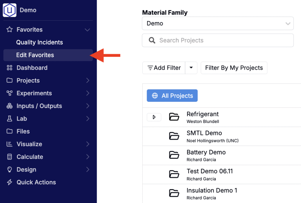 The Edit Favorites page allows users to customize the links that appear in the Uncountable navigation bar, the Favorites tab, landing page, and mobile landing pages. Favorites can be configured at the level of individual users, user groups, or material families.