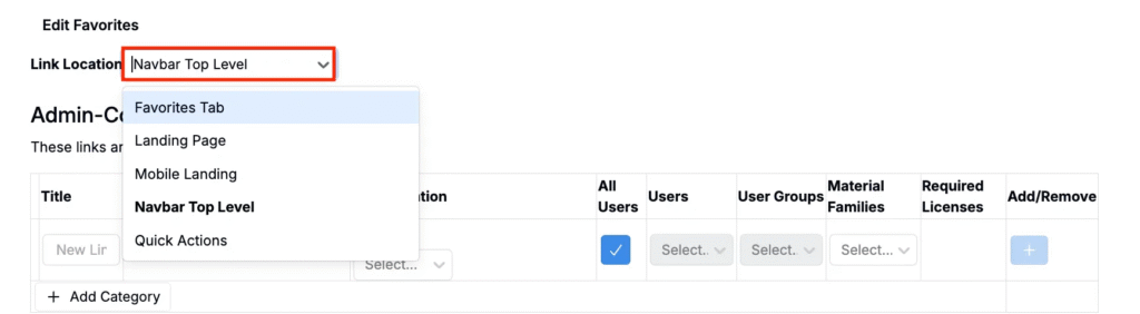 For each link location, favorites can be set individually by users or managed centrally by admins for specific users, groups, or material families.