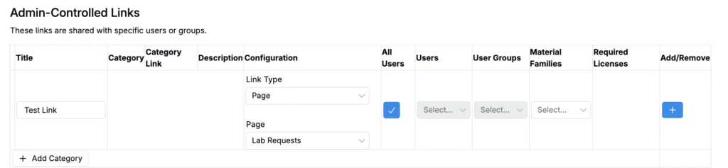 - Admins can also organize links by Category. To create one, click + Add Category, then assign it to relevant links for easier grouping and navigation.