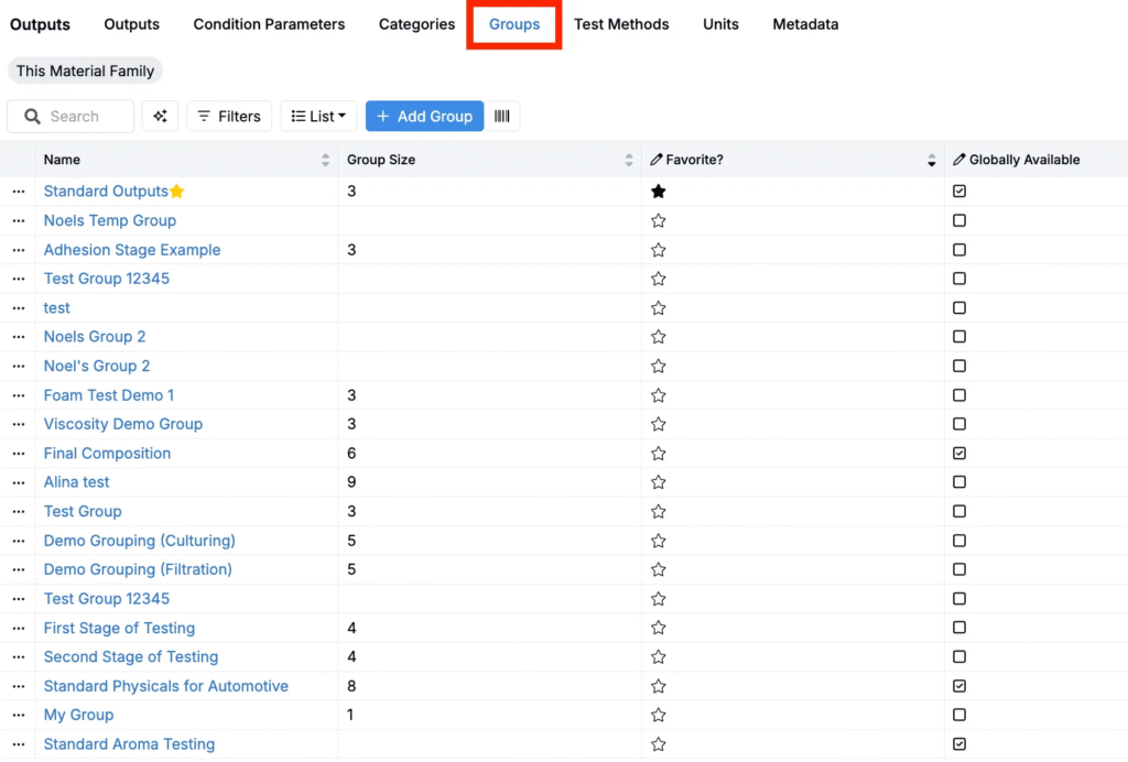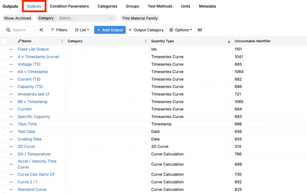 Outputs represent the individual properties or results measured in an experiment, such as tensile strength, viscosity, or color. Each output can have its own unit, test method, condition parameters, and output metadata.