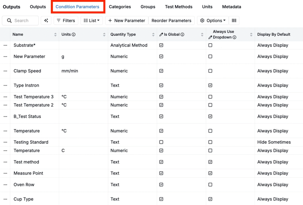Condition parameters define the context of a measurement—such as aging time, test temperature, or test speed. They’re attached to outputs at the time of data entry and allow you to distinguish between measurements made under different conditions.