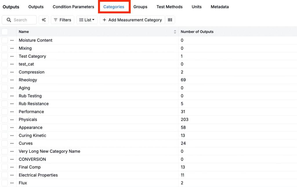 Output categories are high-level groupings used to organize and filter outputs—for example, grouping all “Mechanical Properties” together. Categories can be defined globally or at the project level and may also affect output visibility and permissions.