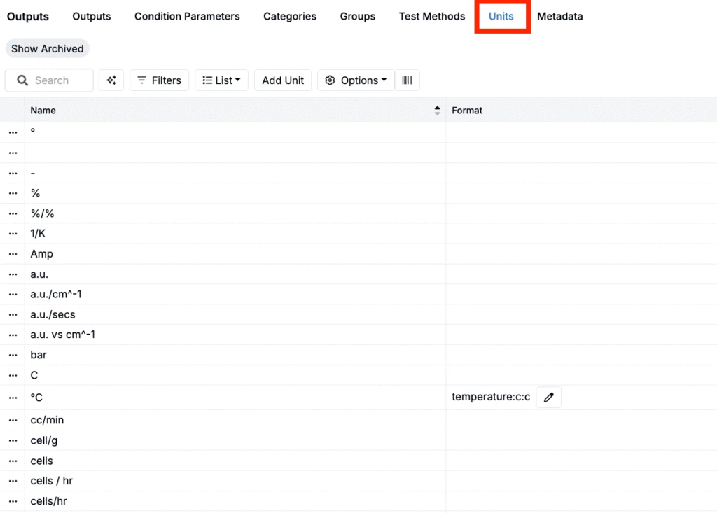 Units specify the scale or measurement dimension for numeric outputs—such as °C for temperature or MPa for tensile strength. Units support conversions and can be customized by project or output.