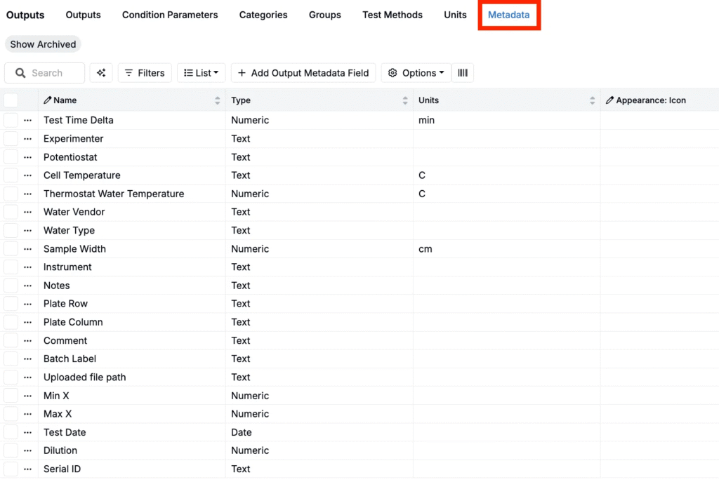 - Output Metadata: Additional details associated with individual measurement values, such as who ran the test or what tray was used. These fields provide context but are not considered part of the core measurement itself.