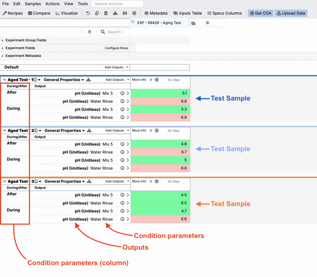- Condition Parameters: Variables like temperature, aging time, or shear rate that describe how a measurement was collected. These are linked to outputs but managed separately to keep data structured and flexible.